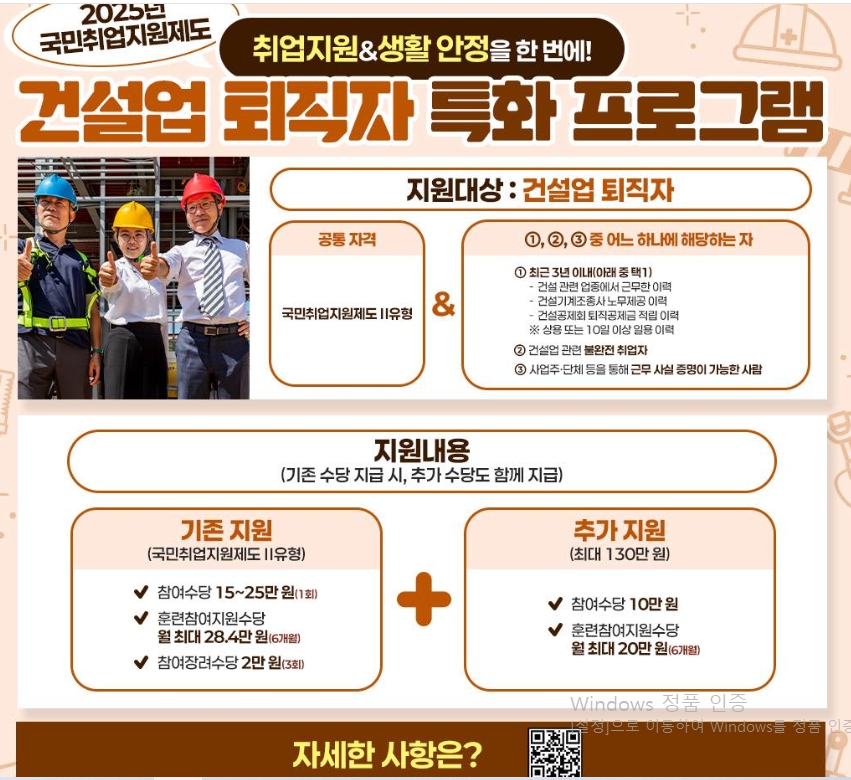 2025년부터 시행되는 국민취업지원제도 '건설업 퇴직자 특화 프로그램'을 통해 최대 130만 원의 추가 수당까지 받을 수 있습니다.